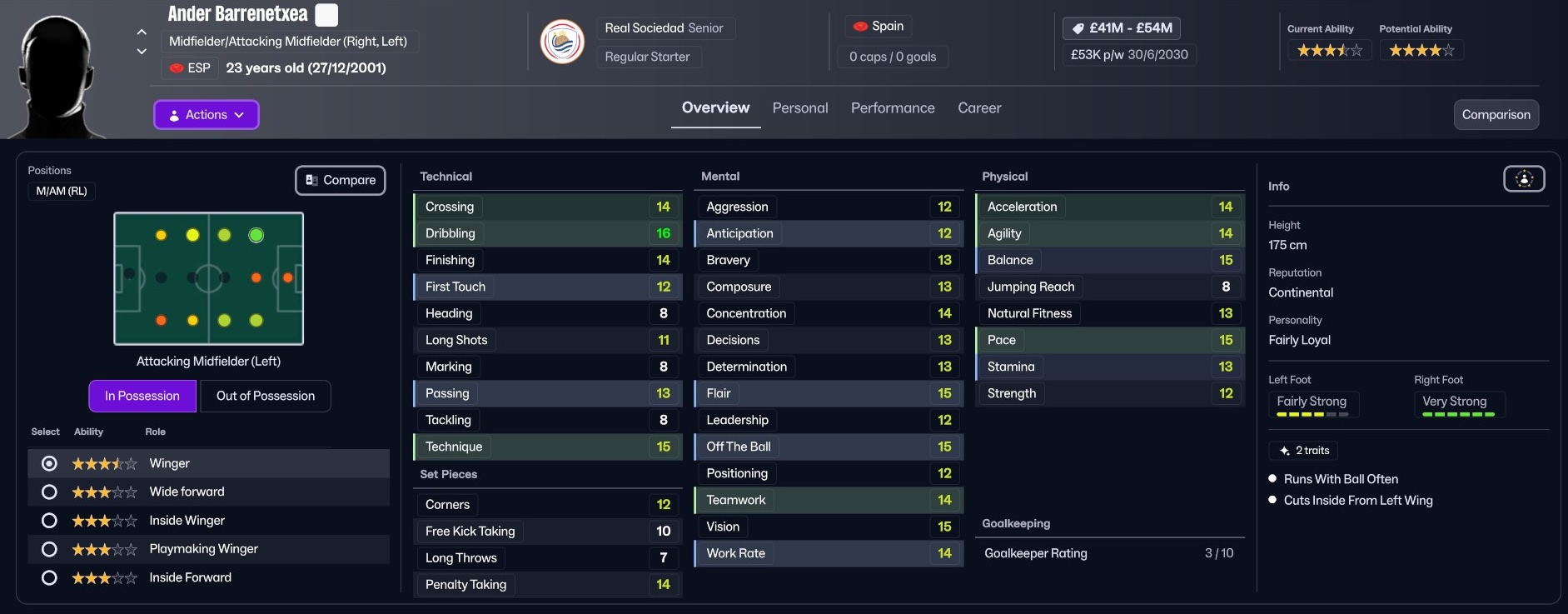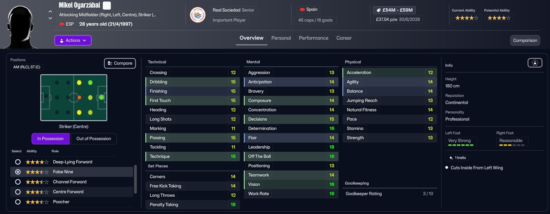 Oyarzabal has started his professional career in a an advanced midfield role but more recently migrated into a striker position. This is exactly where I intend to play him, and where I believe his attributes can be most useful as a creative False 9. My tactical vision involves creating a system that employs a False 9 as its centre-piece not only to better suit Oyarzabal’s unique attribute set, but also to better reflect my personal vision of Basque-style Football (more on this my next tactical blog entry).