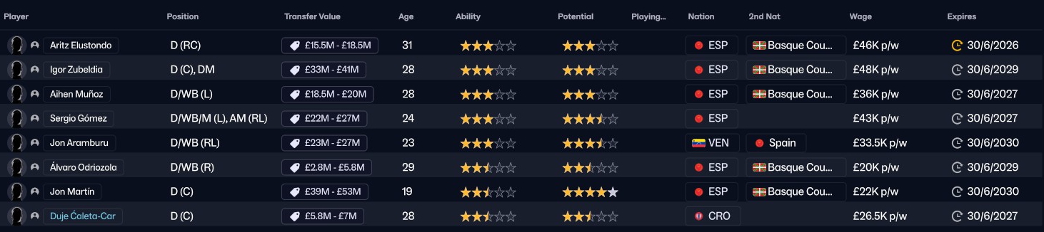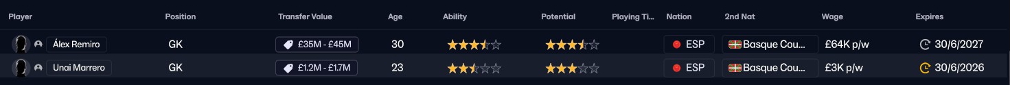 The goalkeeper position is one that does not present any recruitment issues in my objective of making the squad fully Basque. Both of our keepers are of Basque heritage. Remiro is great as a First-Choice keeper. His Backup, 24 y.o Unai Marrero, is good enough to stay in his secondary role. If I see a better Backup keeper then I will sign him.