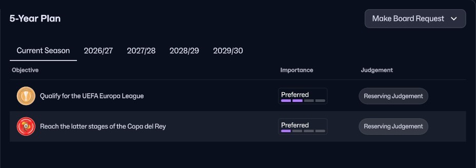 In our 1st season the board prefers that we qualify for UEFA Europa League and reach the later stages of Copa del Rey. Both are quite doable, especially considering the quality of our starting squad. But this might get harder as I start trading away my Non-Basque players.