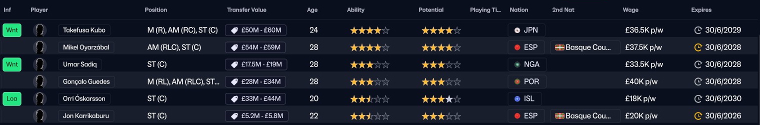 To reiterate, the young players whose development I will keep a closer eye on 2025-26 are the “Three Jons” (Jon Gorrotxategi, Jon Martin, and Jon Karrikaburu), Pablo Marin & Mikel Goti. At the expanse of some of my non-Basque players, I will be giving more training time and game time to these youngsters in order to jumpstart their development. It might be a big gamble and lose us a few matches but it is a gamble I’m willing to take. And I believe John Toshack would be proud.