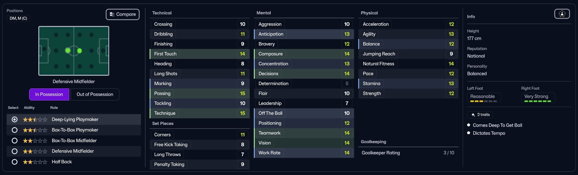 Turrientes is young box-to-box dynamo who pairs well with Gorrotxategi – a playmaker. The two possess skill sets that could work very well in combination. Box-to-Box/DLP role combo is one that worked very well for me in the past FMs. In FM24, I replaced it with Segundo Volante/DLP in the deep version of 4-2-3-1 which was especially effective.