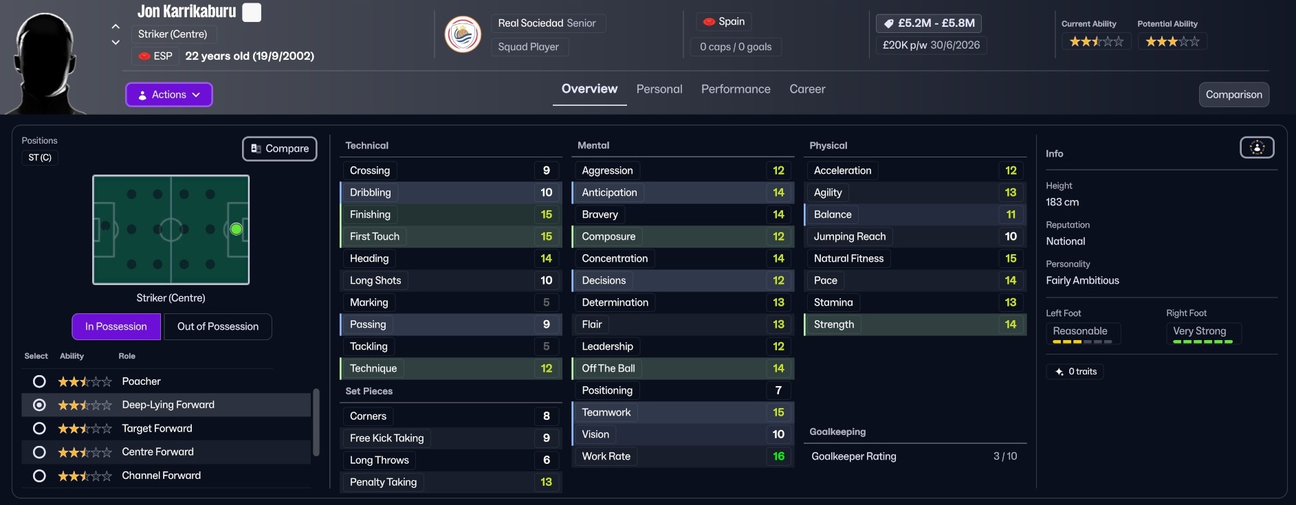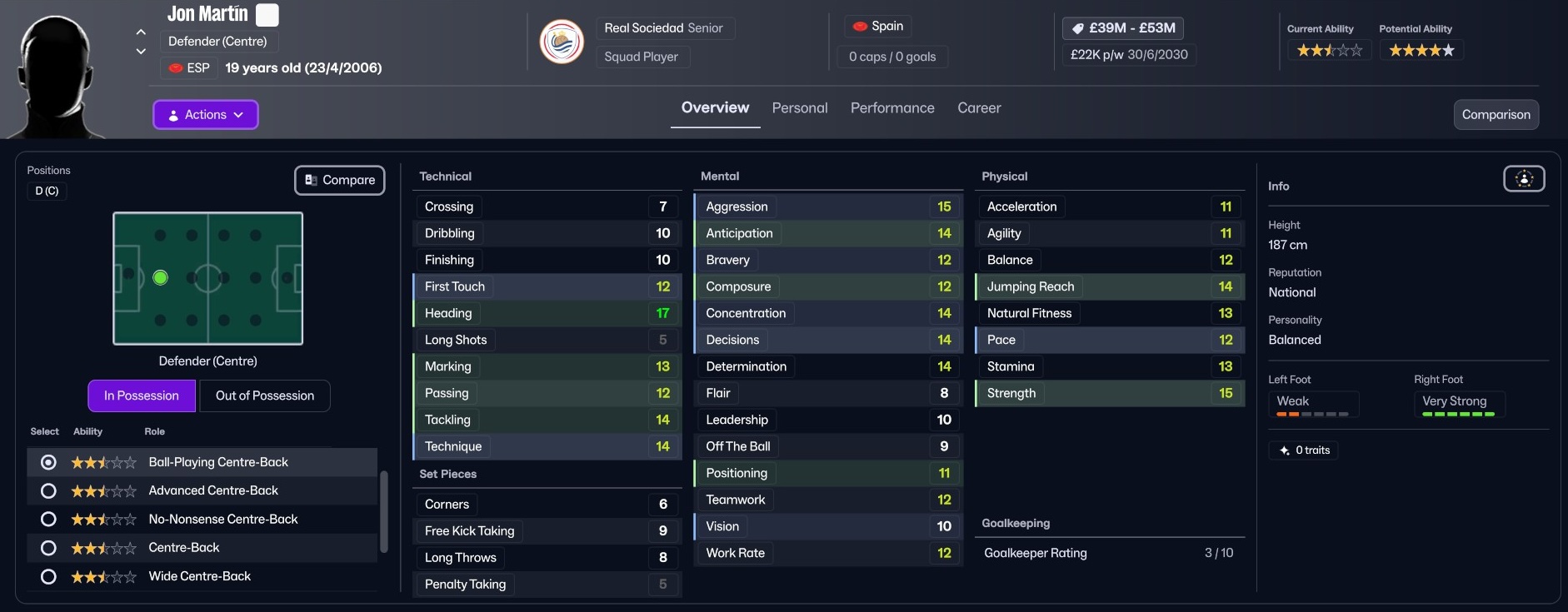 Defence is also where we have our top young prospect, 19 y.o Jon Martin. Spanish news website Onda Vasca described the young defender as one with “excellent heading ability… [who] often finishes off many set pieces… [has] refined technique for playing the ball”. And this is reflected quite accurately in FM26.