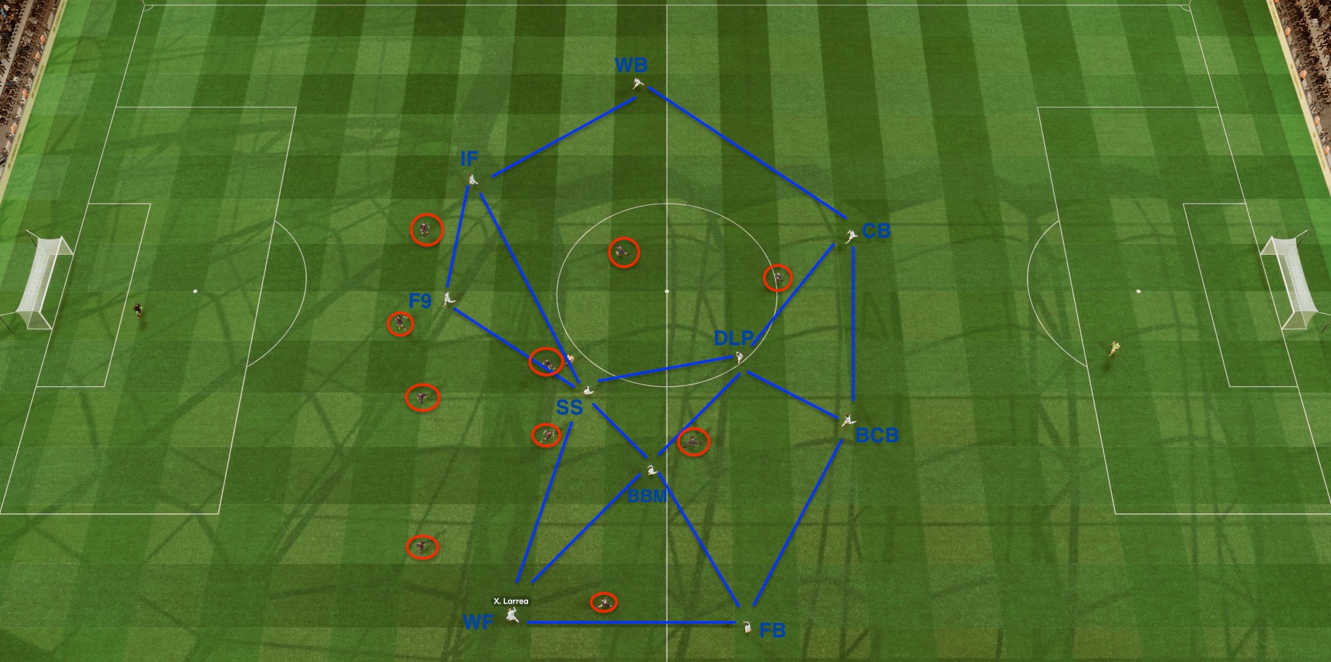 With the right role selection, the ball can be advanced very rapidly up the field. And while the opposition shifts to deal with some of your attacking lanes, other lanes of attack open up. As in example above. The still image above actually resulted in a goal some 5 seconds later. You can view it in the video below. Larrea’s run played a big role in it.