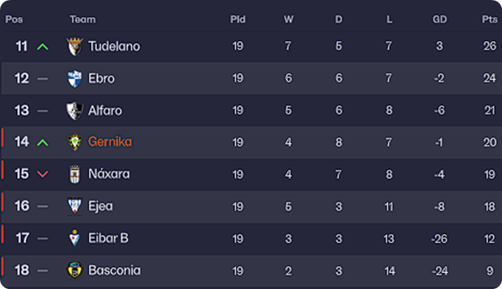 Full time: Gernika 5-1 Alfaro. Positives – massive win, 3.74 (with one penalty) xG created. Morales in the free role is unplayable. Areas to consider – twenty shots, of which eleven were from distance, allowed and 1.62xGA, including one huge 0.89xG goal. 69 passes allowed in our final third – a slight concern and, despite us conceded just once in three, makes me firmly realise that we are still a team at risk. We have a positive goal difference and now have a three point cushion to the relegation zone but there will be much harder tests of our defensive shape. One game whereby we are focused less on this has led to – yes – a great offensive showing but also one of our most vulnerable defensive performances. I cannot allow our standards to slip.