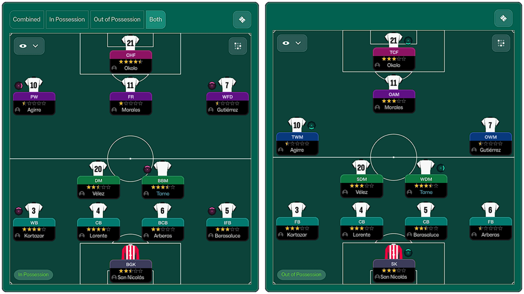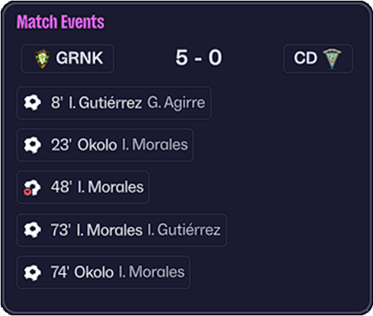 We lined up in an unchanged XI – why would I want to to change our winning formula? Immediately, I felt that there was an opportunity down the right – given that their left side pressed much more aggressively. We got away with it here – as Beralsaluce was dispossessed but their shot was easily saved by San Nicolas. We had our opener on eight minutes – Gutierrez was given too much space and, given their heavier pressing, pulled two men towards him. His lofted ball was met by Morales who put a cross in for Okolo to nod into the goal. The plan was working wonderfully: the central four virtually always had a numerical overload, meaning that Alfaro were constantly pulling players from place to place, leading to isolated areas for us to expose. A set piece – not in my remit at present – led to a handball, to which Moralesconverted the penalty, giving him a goal and an assist inside seventeen minutes. Our plan to attack early on was complete and I instructed the players to play slightly less aggressively at this point: a more balancedapproach. But the goals kept coming! Another central overload, where Agirre has pulled the right back out, leaving space for Kortazar to exploit turned into a magical ball through the middle for Morales to double his tally with.
