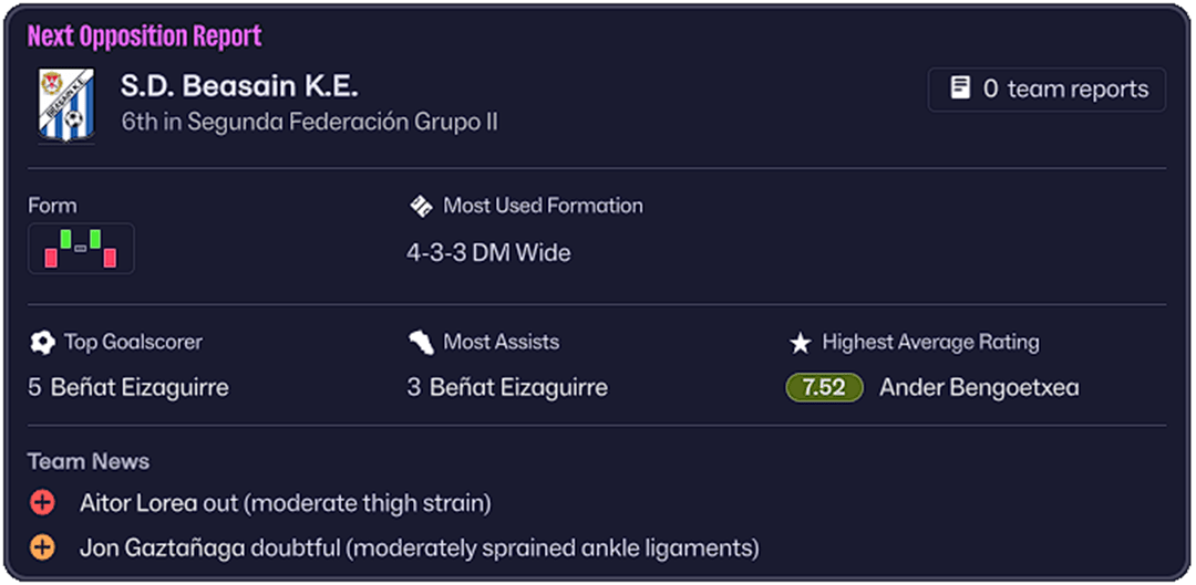 A hard week at work. We’ve spent lots of time training our defensive shapes again. Working to solidify styles in our mid and low block. I need to rely on knowledge of my staff to support in the early times and Dani Fernandez, our assistant with a playing career stretching across the Netherlands, Belgium and Greece, comes with a competent understanding of tactics but, importantly, playing and working at this level since 2015. His advice was noted – compact the pitch both vertically and horizontally – acknowledging that their style isn’t conducive to long-ball play, which can be corroborated with a high ball share and pass completion, especially in deeper areas. Their threat, from key passes alone, comes from the high and wide areas, so we’ll look to double up and push them back into the crowded inside area. Team-wise, we’ll look to exploit the poor form of Asier Sansi but be wary of striker Eizaguirre – who leads the scoring charts from them, scoring most from our weak point, the centre of the penalty area. They also score early, so we’ll step back, be cautious, keep the ball and keep nice and compact to grow into the game.