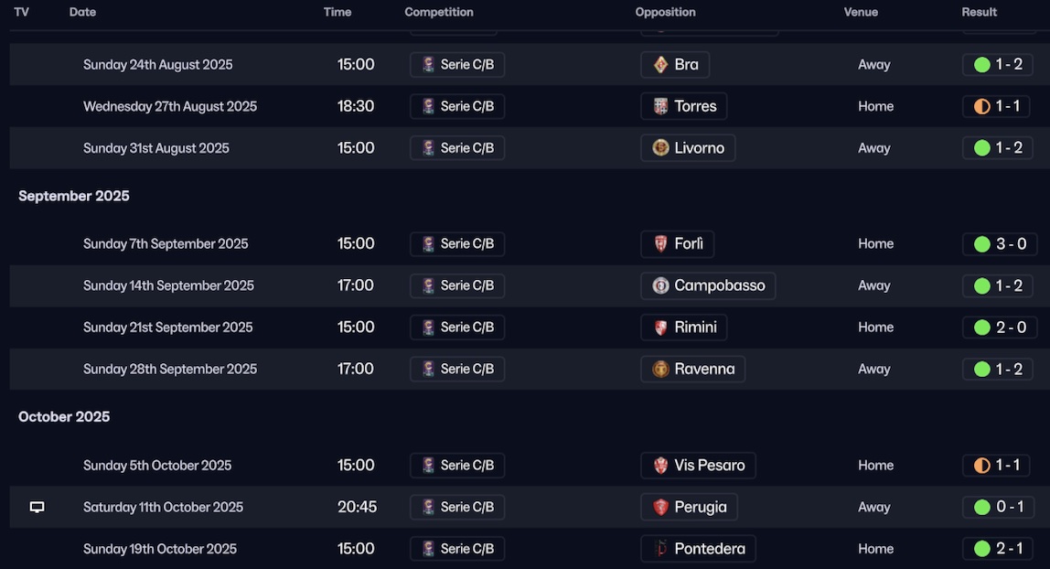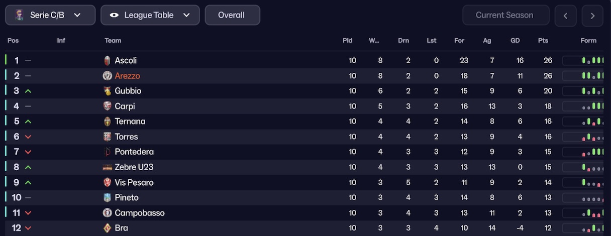 Ten games into the Serie C/B campaign, life in Tuscany feels balanced on that fine line between belief and realism. We sit second in the table, level on points with Ascoli, and still unbeaten. Eighteen goals scored, seven conceded — a solid foundation, if not yet the finished article.