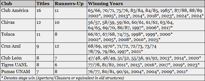 More commonly though, Mexican football goes through ebbs and flows, with titles and trophies spread between a number of clubs. Los Cuatro Grandes (The Big Four) are a group of clubs consisting of Chivas, Club América, Cruz Azul and Pumas UNAM, and all of these sides rank within the top seven of the most successful Mexican sides based on titles won.
