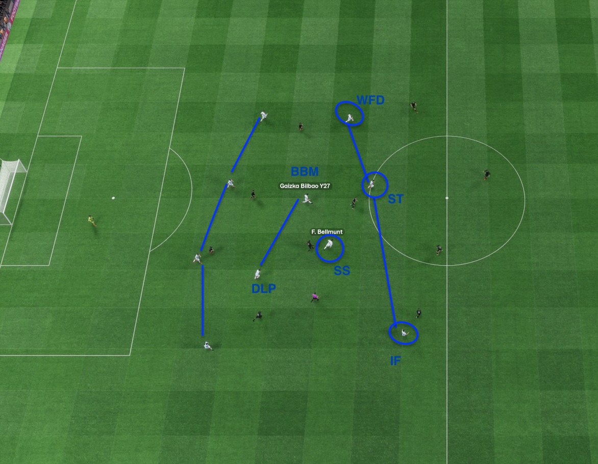 Third Man Runs are done to bypass opposition defenders in the most efficient and effective way possible. Definitely in Basque fashion. The first player (my IF or False 9 for instance) draws opposition pressure, the second player receives a pass (my WFD), and the third player (often my BBM, or Wingback) makes a run into the newly created space to receive a pass from the second player, often after the ball is laid back or redirected. This strategy is effective because it moves the opposition defense out of position and exploits the space created after the defenders’ attention was redirected towards the ball.