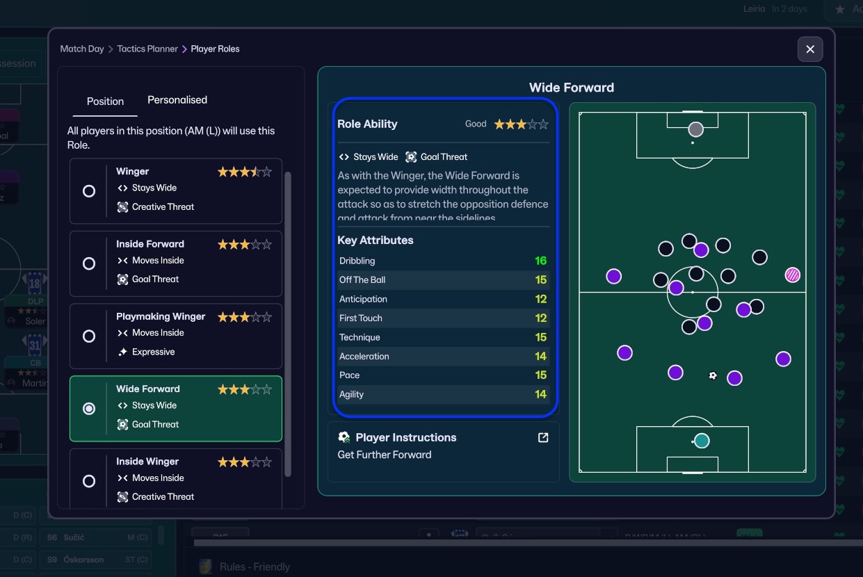 With the False 9 dribbling and dropping deeper when in possession of the ball, I want the other three attacking players to move into the spaces in front and to the sides of the False 9 – especially the channels (spaces between CBs and Fullbacks) and the wider flanks. Ideally, I want my attacking players to occupy all of these spaces. In my 4-2-3-1 formation, I have the SS and IF (IF suits my players best but you could theoretically use any other wide attacker role here, as long as it cuts inside) going into the central and channel spaces while the other wide attacker is instructed to stay wide and attack from the left flanks. For this task, the Wide Forward is a great new role in FM26. Well it’s not really new, as much as a fusion of some other old roles – principally traditional Winger and Raumdeuter (no longer available in FM26).