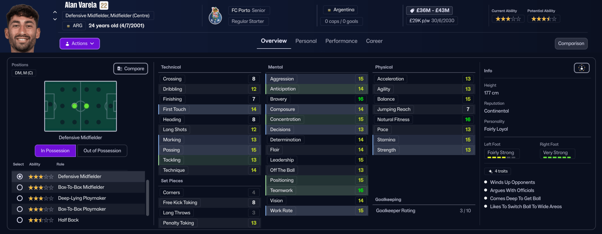 Alan ‘The Holder’ Varela has the perfect blend of technical, mental, and physical attributes for this role. Whilst his traits such as ‘Comes Deep To Get The Ball’ and ‘Likes To Switch Ball to Wide Areas’ are also appealing.