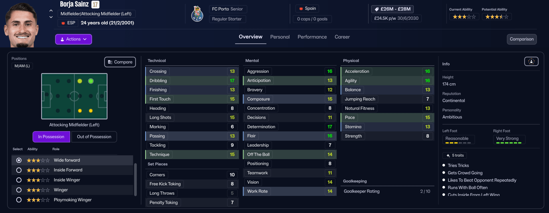 Borja Sainz – 19 goals in the Championship across 2024/25 was enough for Porto to pay £13 million for the Spaniard’ signing. Borja has taken ownership of the left flank, breaking into the TOP 5 dribblers in the Primeira Liga. I though long and hard about his designated role – flipping between the Inside Forward and Wide forward. I opted for the latter as the positioning will help to provide more width throughout the attack. This should help to stretch the opposition defence and still be one of the main attacking threats.