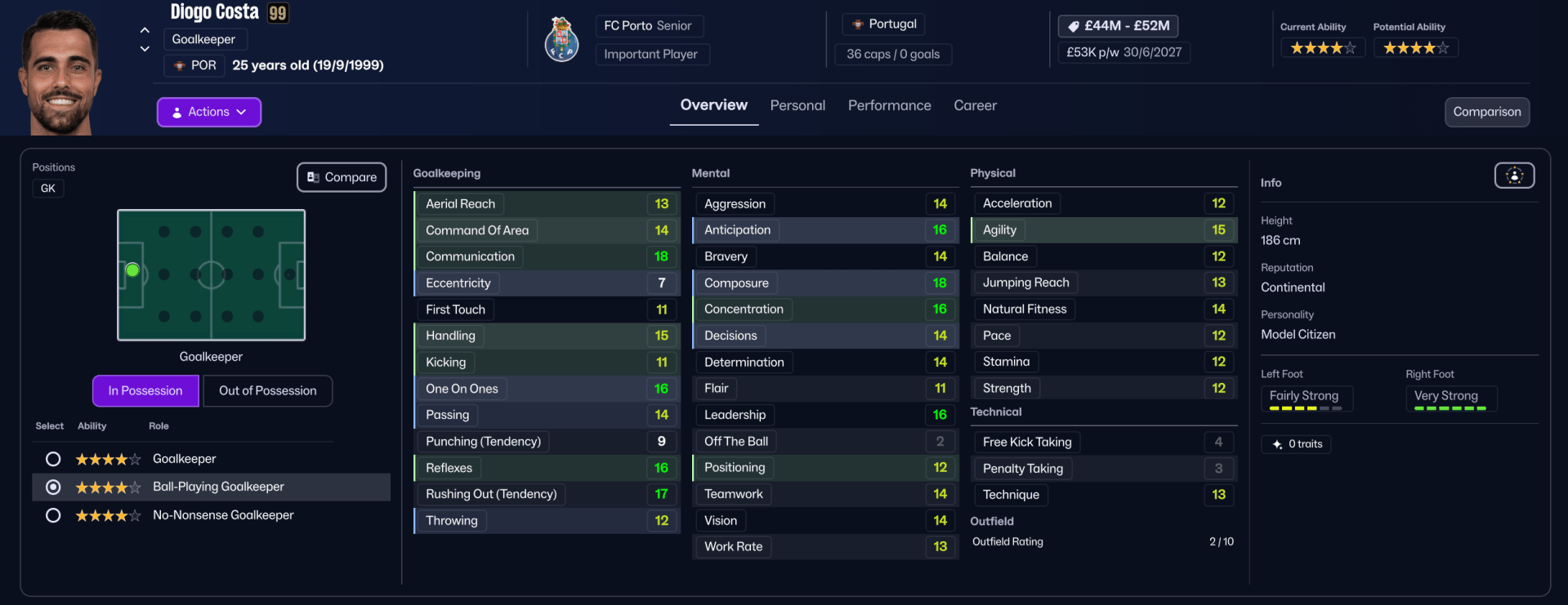 Diogo Costa is the perfect fit as the system’s primary playmaker, possessing solid passing (14), vision (14), and composure (18) to confidently participate in the initial Lure Mechanism, turning the opposition’s press into a tactical advantage.