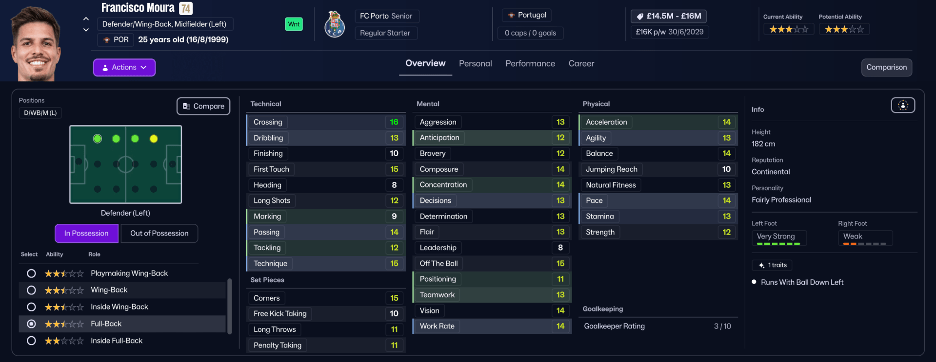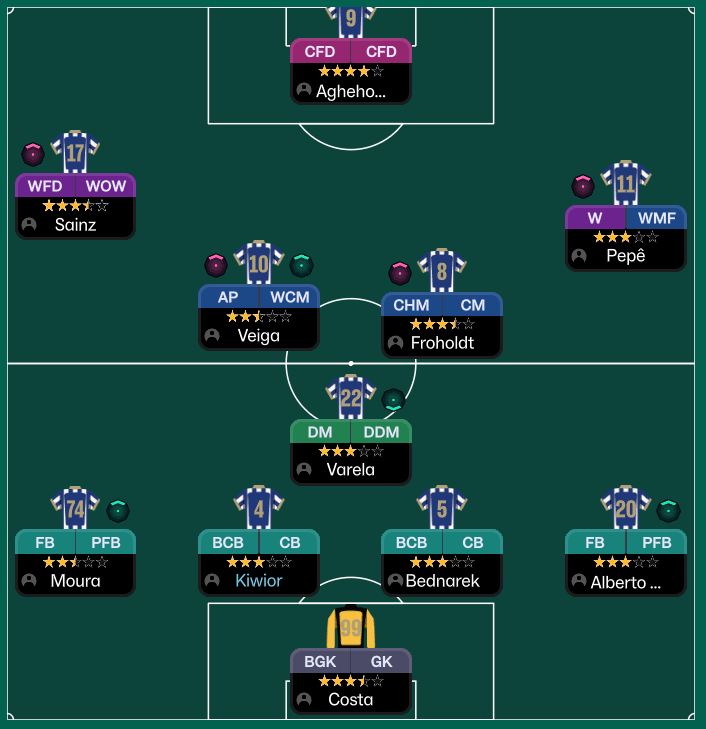 Francisco Moura is critical to the central overload, as his technical quality (Passing 14, Technique 15, and Vision 14) and off the ball movement (15) allow him to consistently tuck inside, forming the midfield base and linking play quickly to create superior numbers centrally.