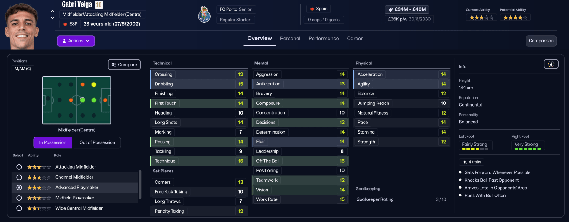 Gabri ‘The Creator’ Veiga – The 23 year-old is arguably better positioned as an attacking midfielder. Especially when you consider his long list of traits. However, I feel that he would be successful playing in the ‘Advanced Playmaker’ role which looks to operate in the space between the oppositions defence and midfield. He has the right profile to enable him to operate in tight spaces and should still make some of those runs in the channel due to his player traits.