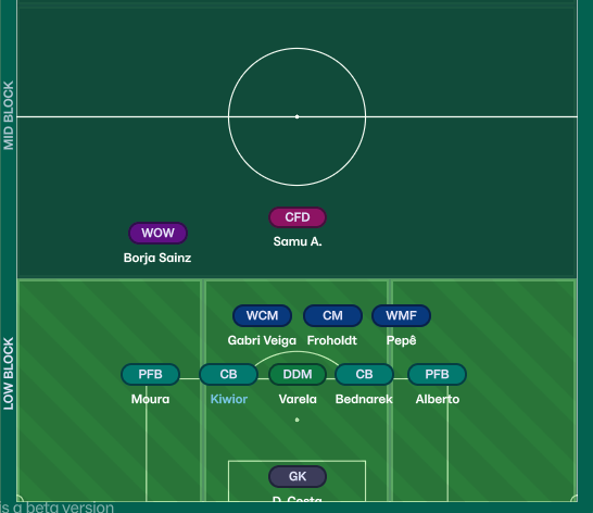 The Right Flank: Carrying and Versatility: The right side offers a different profile. Costa is a less expressive passer than Moura, but he’s a significantly more effective ball carrier. This is paired with Pepê, a true hybrid who can switch between creation and running. Up front, Froholdt will likely play higher, constantly making movements in behind the defense. This advanced role by Froholdt is the catalyst: it creates the necessary space for Costa to invert and generate crucial overloads in the right channel. This flexibility means Gomes can fluidly shift between being ball-dominant and being primarily movement-focused.