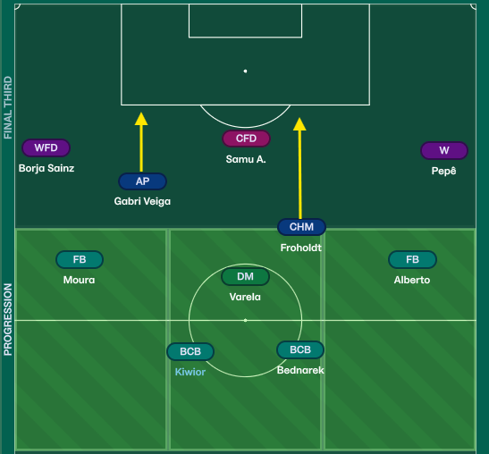 Porto’s midfield foundations adhere to all of the above. However, it is in the final third where Farioli’s attack is flexible and unpredictable through fluid forward movements and vertical threats.