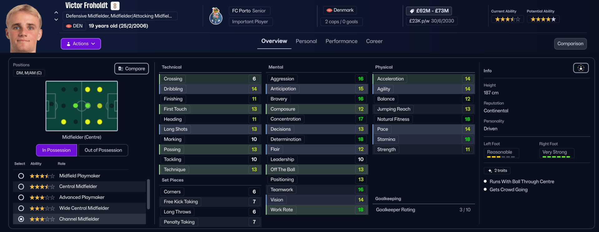 Victor ‘Five Lungs’ Froholdt – Do not let this young man’s age deceive you, at just 19 years old Victor is an absolute machine! Teamwork, Work Rate, Stamina, and Natural Fitness all at an elite level, and I won’t even bother listing off some of those mentals – PI’s added are ‘Move into channels’, ‘Make more forward runs’, and ‘Roam from position’.