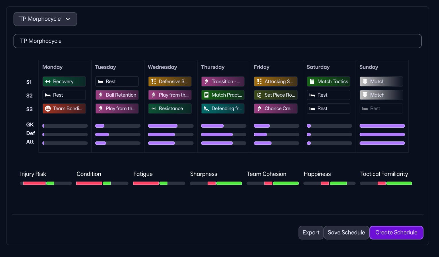 TP manages complexity by breaking the game down into four fundamental moments, which structure the daily training plan. The Morphocycle is the weekly pattern designed to manage the effort-recovery continuum.