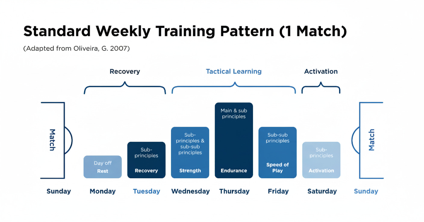 This is the operational unit of TP. It is a weekly cycle of stimuli and recovery, where the dominant type of muscular contraction (Velocity, Strength, Speed, Endurance) alternates to ensure peak performance on Match Day, with Wednesday often being the most intense day.