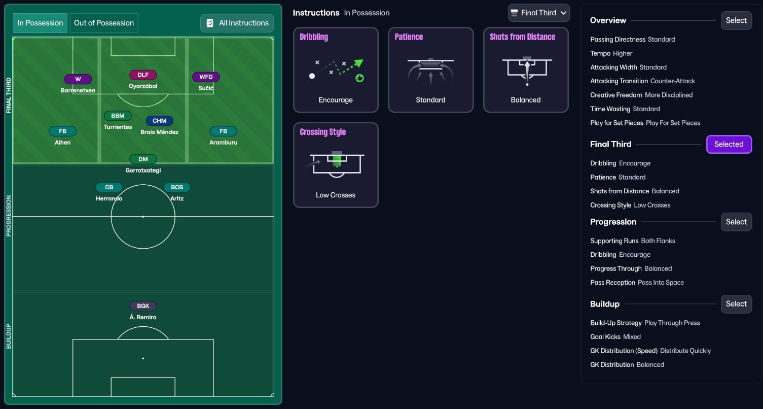 Instead I prefer to leave most of my tactical instructions unchanged between matches irrespective of the opposition. The changes that I do make before each match must be systematic and predictable. Not reactive and random. This reflects my primary tactical DNA – disciplined Basque Football distilled to its absolute essence.