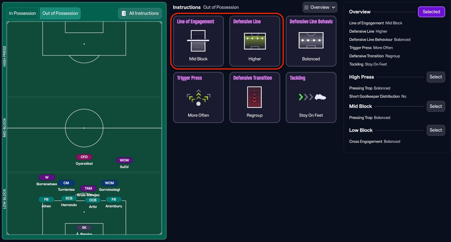 In the current tactic, the only OOP instructions which I ever really adjust are my “Line of Engagement” and “Defensive Line” ones. That and some midfield role changes. Sometimes I will ask my Winger to play as Wide Midfielder when we need more protection in our Mid Block or Low Block. I will also adjust tactic’s overall mentality sometimes depending on the flow of the game and how desperate we are for a goal (or to protect the lead). I tuned my tactic to the point where none of these tactical changes ever increases my overall tactical intensity. Even when playing on Attacking mentality with the highest LOE and DL, out overral tactical intensity remains 5/7.