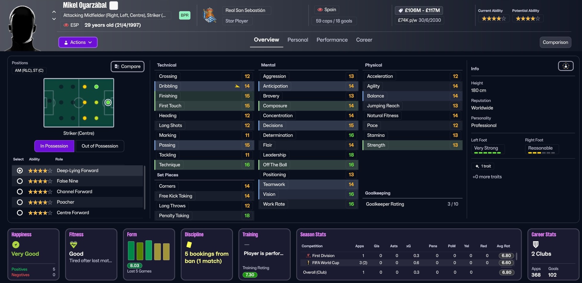 My hope for season 2 is to get Mikel even more involved in attack while maintaining his essential “link-up” function. Also, as you can see from his profile, Mikel is no push-over physically and is rather well suited to Deeplying Forward Role. I think as he ages, it might be an advantage to utilize his Balance, Jumping Reach and Strength rather than relying on his declining Dribbling and Acceleration. The DLF role should serve similar link-up function as the False 9 but do it in a much more physically imposing manner with less need to high mobility. In accordance with my preferred Basque Style, I would like Real Sociedad to inject even more physicality into our tactics in order to help us succeed in those ever-important battles against superior possession-hungry sides.