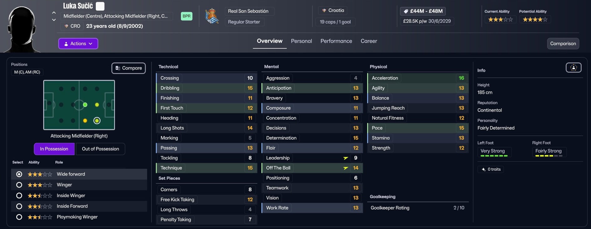 Players like Luka Sučić with his good Dribbling, Anticipation, Off The Ball and Mobility (Acceleration and Pace) can thrive in the right type of tactic with those two instructions selected. High Mobility, Off the Ball and Anticipation are all needed for “Pass into Space” to work well while Dribbling is pretty self-explanatory.