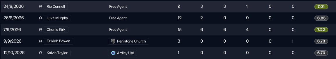 Alongside the Crewe connections, Howarth brought in Rio Connell, a forward whose nine appearances had yielded three goals, three assists, and a Player of the Match award—a more than respectable return. Zack Littler added depth in midfield with two assists from five outings, while Ezikiah Bowen arrived from Penistone Church to bolster the options. Kalvin Taylor completed the summer business, a late addition from Ardley United designed to provide cover across the squad.