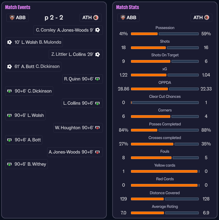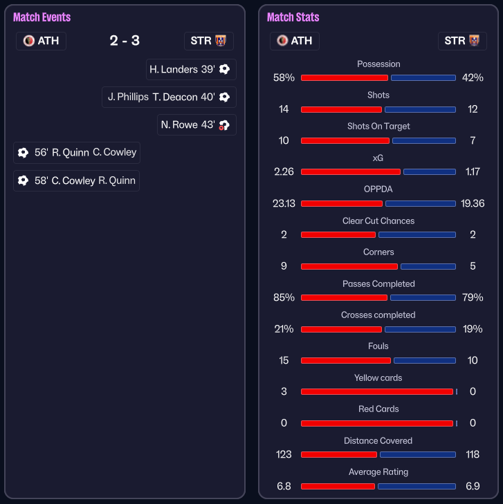 Cowley’s 8.5 match rating told the story of what might have been. He’d been magnificent in that second half—a goal and an assist—but the damage had been done before the break. The xG told its own tale: Atherstone 2.26, Stratford 1.17. On another day, the comeback would have been complete. This wasn’t that day.