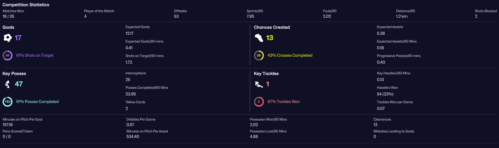 The striker had been nothing short of sensational. Seventeen goals from thirty-five appearances. Eleven of those coming in the league, with two assists to accompany them. Four Player of the Match awards. An average rating of 7.03, with a maximum of 9.60 in one particularly devastating display. The numbers painted the picture of a forward operating at the peak of his powers.