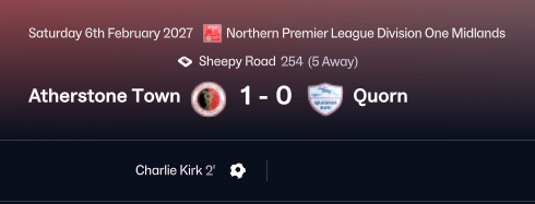 Quorn visited Sheepy Road on 6 February, and Charlie Kirk settled the contest inside two minutes. Two minutes. The kind of start that takes the sting out of any opponent, the kind of goal that has the home crowd believing from the first whistle. The remaining eighty-eight minutes were comfortable, professional, and ultimately uneventful. 1-0. Three points. Two hundred and fifty-four supporters went home happy.