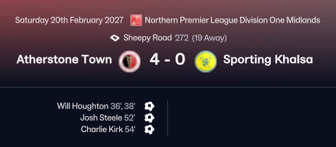 Josh Steele added a third on 52 minutes, and Charlie Kirk completed the rout on 54 minutes. 4-0. Two hundred and seventy-two supporters witnessed the demolition, nineteen of them from Khalsa. The visitors had no answer to Atherstone’s relentless attacking play, and by the final whistle, the only question was how many more goals the hosts might have scored.