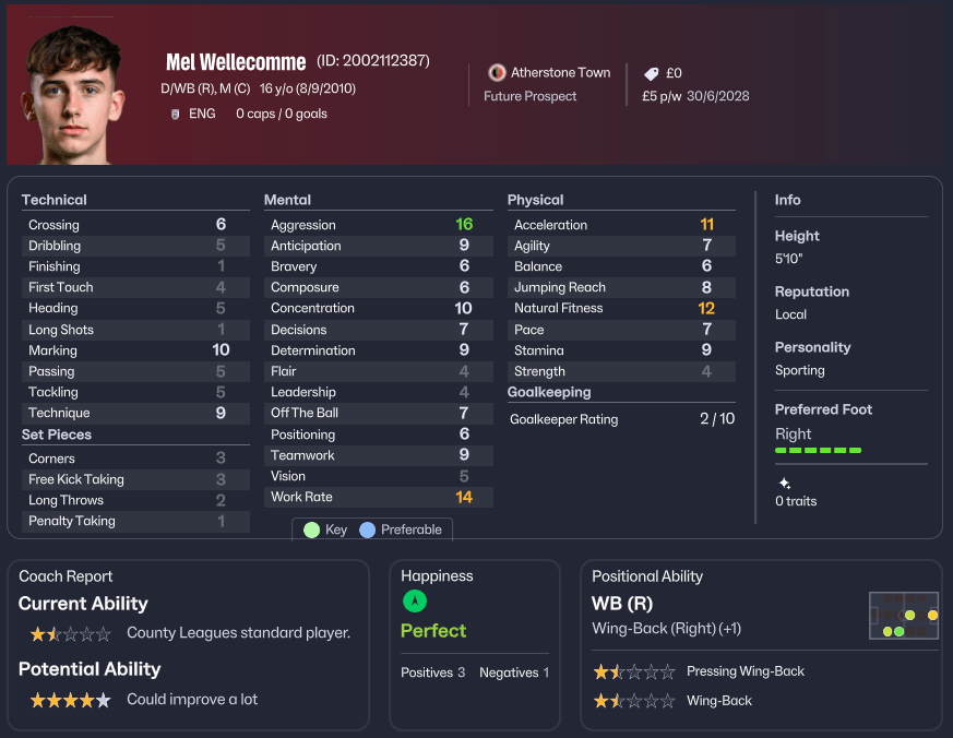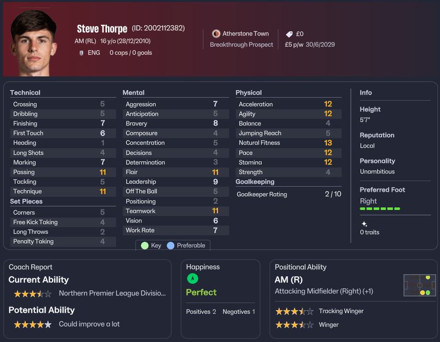 Steve Thorpe brought something different. The attacking midfielder, still just sixteen, possessed the technical attributes that coaches dream of developing. His passing, technique, and flair were already at a level that suggested Northern Premier League Division One capability. Add in his pace, acceleration, and agility, and you had a player who could unlock defences. The assessment noted him as a breakthrough prospect—someone who might force his way into first-team reckoning sooner rather than later.