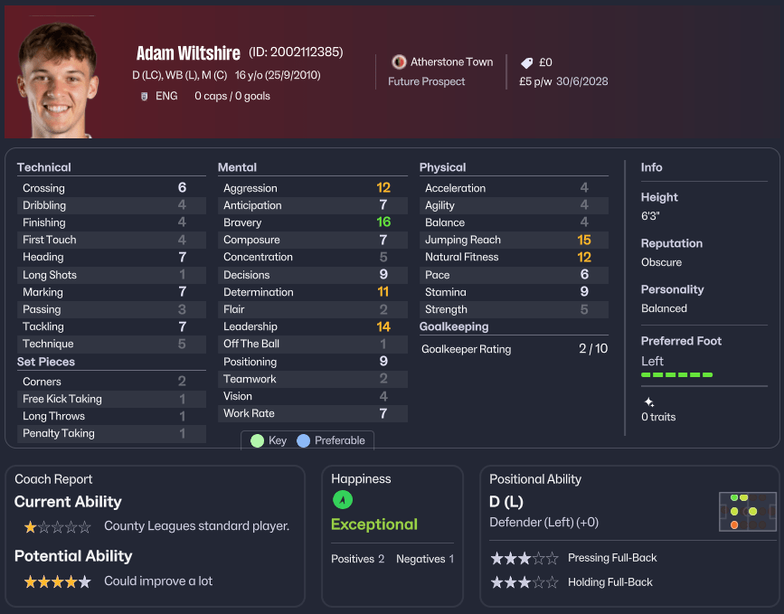 Adam Wiltshire, a sixteen-year-old left-sided defender, stood out for his physical presence and mental fortitude. At 6’3″ with a jumping reach that already troubled older opponents, the youngster possessed the raw materials of a proper centre-half. His bravery rating was exceptional—sixteen out of twenty on the coaching staff’s assessment scale—while his leadership qualities and determination suggested a player who could captain sides in the future. Currently assessed as County Leagues standard, the scouts believed he could improve significantly. A future prospect worth nurturing.