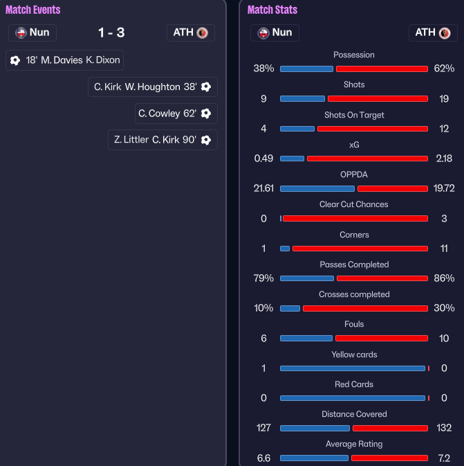 The second half was a masterclass in game management. Atherstone controlled possession, restricted Nuneaton to half-chances, and waited patiently for their moment. It arrived on 62 minutes. Chris Cowley, playing in a deeper central midfield role, received the ball on the edge of the box, took a touch to set himself, and placed a shot into the bottom corner from close range. Clinical, composed, and utterly deserved. 2-1 to the visitors.