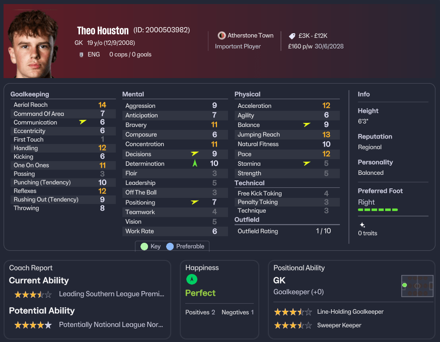 Theo Houston solved the goalkeeper problem that had plagued Atherstone since Auton’s mid-season departure. The 19-year-old arrived with aerial reach (14), handling (12), reflexes (12), and one-on-ones (11) that immediately made him first choice. At 6’3″ with a jumping reach of 13 and pace of 12, he possessed the physical tools to dominate his area. Current ability sat at Leading Southern League Premier standard; potential stretched to National League North/South. The number one jersey was his to lose.