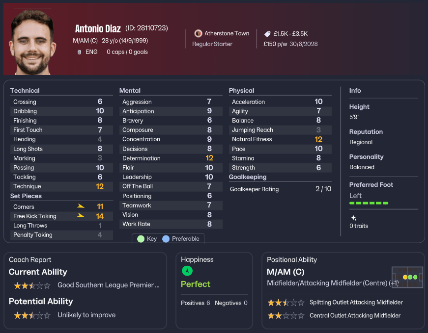 Antonio Diaz completed the summer business. The 28-year-old central midfielder offered something different—experience. With technique (12), dribbling (10), passing (10), and flair (10), he provided creativity from deep. His set-piece ability stood out: corners (11) and free kick taking (14) gave Atherstone a genuine threat from dead ball situations. Current ability sat at Good Southern League Premier standard. He wouldn’t develop further, but he didn’t need to. Diaz was ready now.