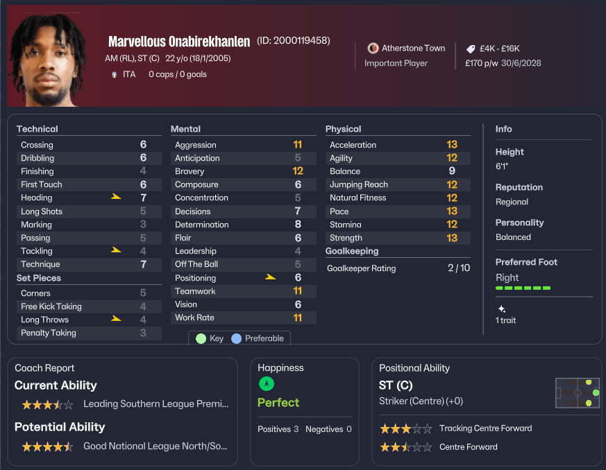 Marvellous Onabirekhalen — the name alone demanded attention. The 22-year-old Italian striker arrived from Coleshill Town, the very side Atherstone had dismantled 5-2 on the final day of the season. He’d been their top scorer with seventeen goals for a team that barely survived. At 6’1″ with pace (13), acceleration (13), and strength (13) to burn, he offered a physical presence that would trouble step three defences. His potential ceiling, according to the scouts, sat at National League North/South level. An important player from day one.