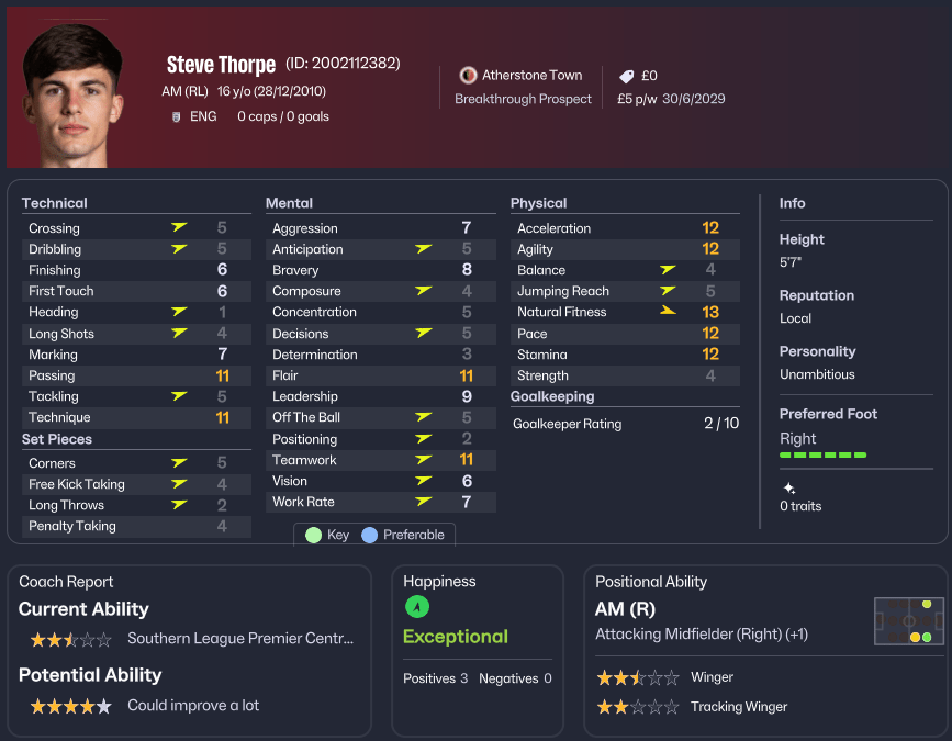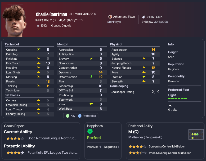 Charlie Courtman represented perhaps the most exciting signing of the summer. A 20-year-old central midfielder already assessed as Good National League North/South standard—a level above where Atherstone currently played. His potential? EFL League Two. The actual Football League. Passing (13), tackling (11), first touch (10), marking (8), and acceleration (14) made him the complete midfield package. Star player status from the moment he walked through the door.