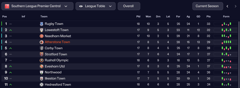 Rugby Town led the division on thirty-three points from eighteen games, their ten wins setting a pace that would challenge anyone. Lowestoft Town sat second on thirty-two, Needham Market third on thirty-two as well. Atherstone, on twenty-nine from seventeen, occupied fourth.