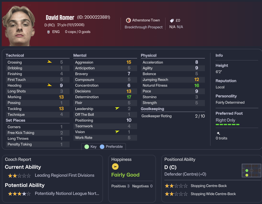 David Romer added depth at centre-back. The 21-year-old stood 6’2″ with determination (17), aggression (15), marking (13), and tackling (13). Currently assessed as Leading Regional First Divisions standard, but his potential reached Southern League Premier level. A breakthrough prospect who would push for opportunities.