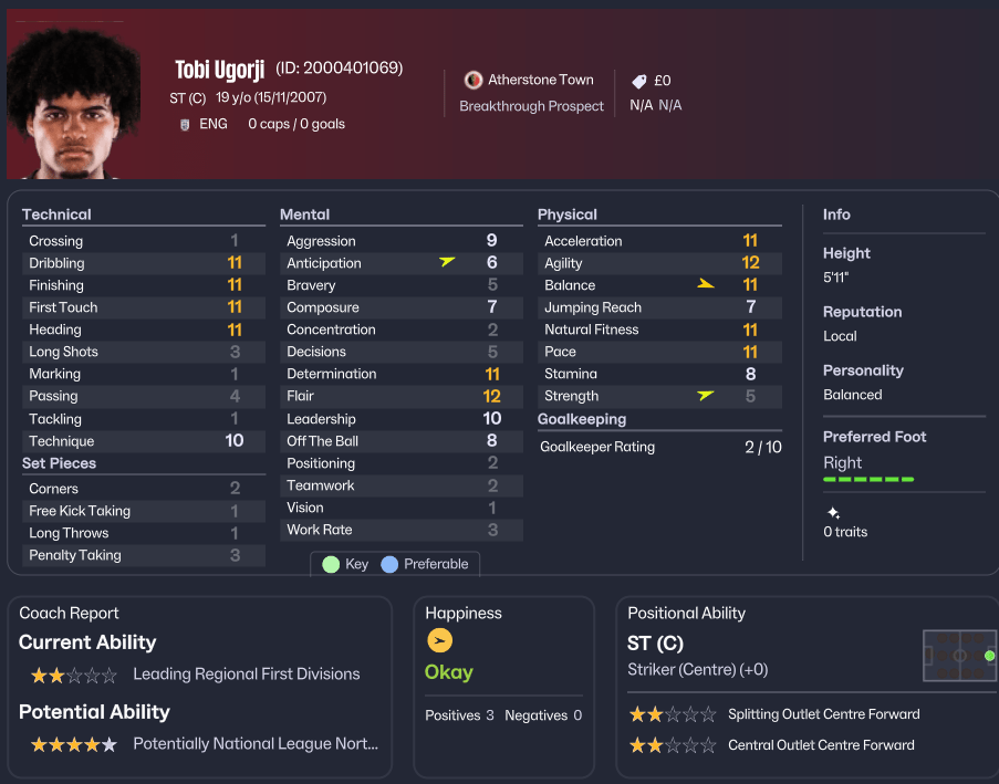 Tobi Ugorji joined from Birmingham City. A 19-year-old striker with technical gifts that looked almost too good for this level. Dribbling (11), finishing (11), first touch (11), heading (11), and technique (10) painted the picture of a forward comfortable with the ball at his feet. His flair (12) and leadership (10) suggested personality to match the ability. A breakthrough prospect with a ceiling that could take him to National League North/South.