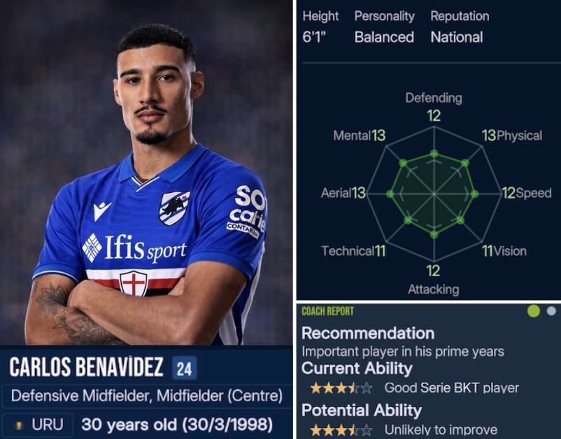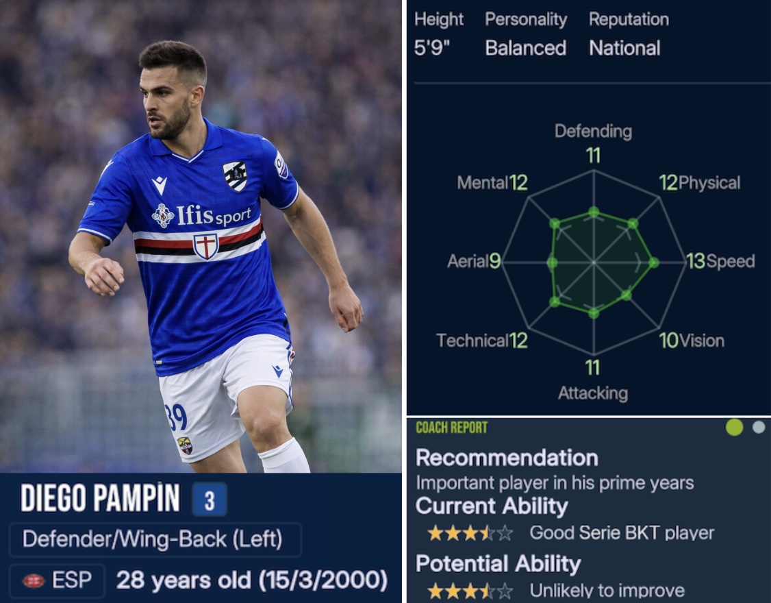 It was important I turned my attention to the left flank – a position that would inevitably be tested week after week in Serie A. Diego Pampín was recruited not as a luxury attacking wing-back, but as a defender capable of balancing defensive discipline with forward intent. His anticipation, concentration and work rate make him reliable in one-versus-one situations, while his acceleration and agility allow him to recover quickly when transitions break down. In Disciplina & Transizione, the full-backs must be selective rather than reckless; they support attacks when space opens, but prioritise defensive shape above all else. Pampín’s energy and positional awareness suit that demand.