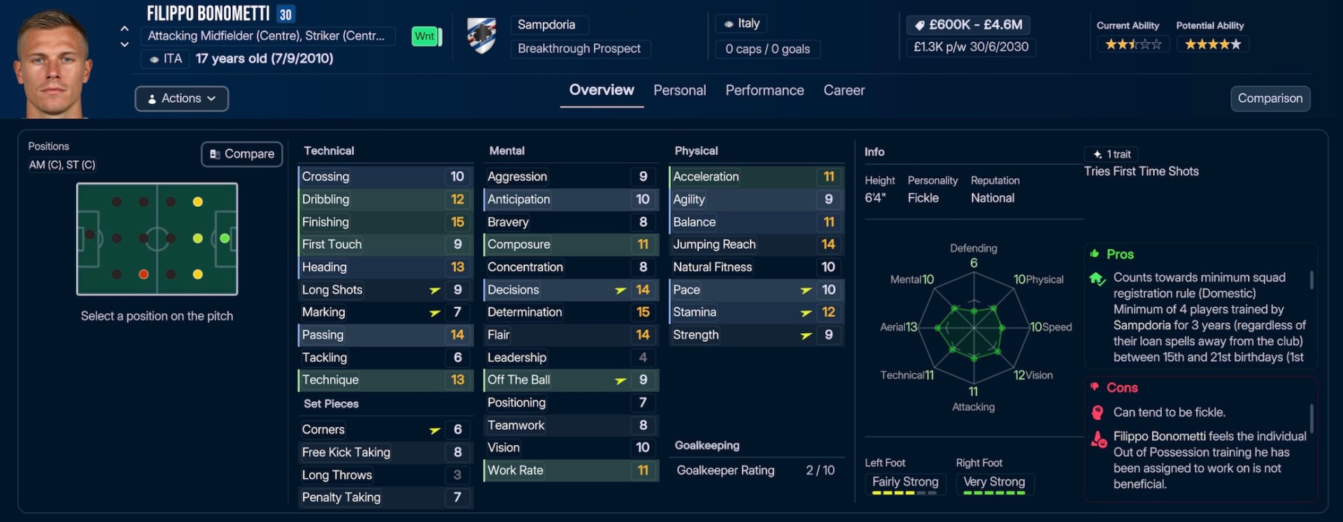 I also signed another left back over over the summer. Brando Moruzzi was signed on an expiring contract from the Juventus U23’s where he made 19 appearances last season, with an 7.10 AVG. He offers pace and strong tackling and will be working with coached to improve his crossing and final ball.