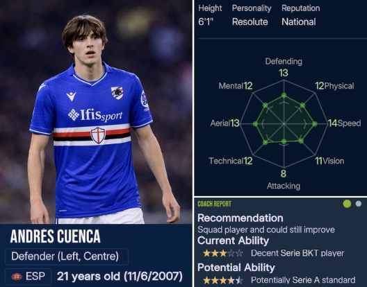 Andrés Cuenca was another player whose loan spell convinced me he belonged at the club permanently. Last season he was asked to play out of position at left-back, yet still showed the defensive intelligence and composure that first attracted us to him. Naturally a centre-back, the former Barcelona “La Masia” graduate reads the game well, is comfortable on the ball, and has the anticipation required to defend deeper spaces in Serie A. His ability to step into wider defensive areas also provides valuable flexibility in the back line, something that becomes particularly useful when our half-back drops between the centre-backs and the structure shifts during transitions.